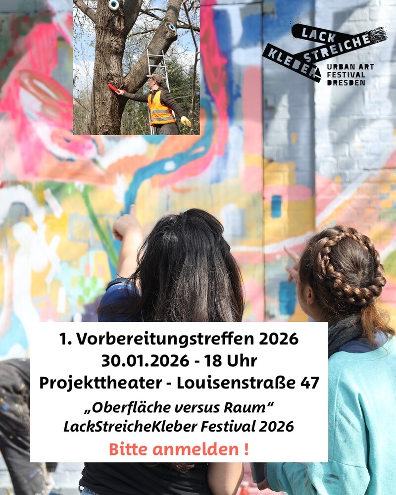 Am 30.1.2026 findet das 1. Vorbereitungstreffen zum 8. LackStreicheKleber - Urban Art Festival Dresden statt. 2026 steht unter dem Titel „Oberfläche versus Raum“ Was damit gemeint ist, wann das Festival stattfinden soll, welche Aktionen geplant sind und wie ihr euch beteiligen könnt erfahrt ihr beim Treffen.