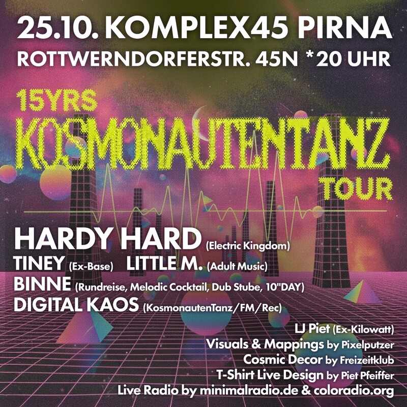 Visuals by Pixelputzer, Cosmic Decor by Freizeitklub, T-Shirt-Design by Piet Pfeiffer, LJ by Piet vom Kilowatt und live Radio Transmission by minimalradio.de & coloradio.org.
