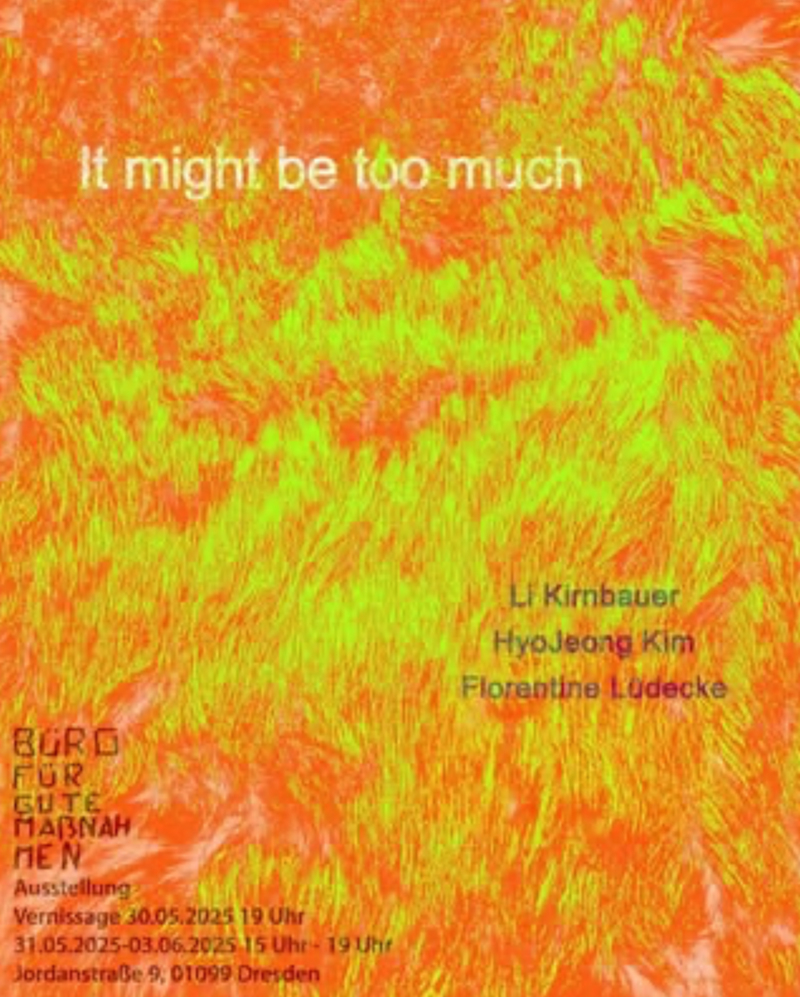 Die Ausstellung "It might be too much" vereint drei unterschiedliche künstlerische Positionen. Gezeigt werden Arbeiten von Florentine Lüdecke, HyoJeong Kim und Li Kirnbauer. Alle drei haben im selben Jahr vor 5 Jahren ihr Studium an der HfBK begonnen und seitdem begleiten sie sich im Künstlerischen als auch Privaten. Wir möchten nun die gemeinsame Studienzeit mit einer Ausstellung abschließen bevor es nächstes Jahr an das Diplom geht. "It might be too much" handelt von Freund*innenschaft, Solidarität und Ängste und vereint Malerei, Skulptur, Fotografie und Installation. Von unterschiedlichen künstlerischen Positionen und Medien ausgehend haben wir uns auf die Suche nach gemeinsamen Thematiken gemacht und die unterschiedlichen Beziehungen der Arbeiten zueinander erforscht. So wie auch unsere Freund*innenschaft, stehen auch unsere Arbeiten in Beziehung zueinander, bestärken sich oder werfen neue Fragen und Perspektiven auf.