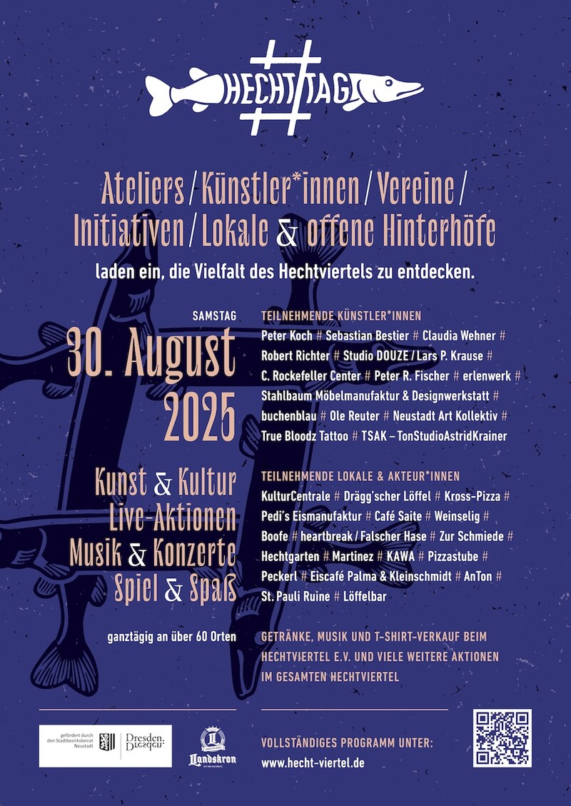 Zum HECHT#TAG präsentiert sich das Hechtviertel von seiner besten Seite. Im Viertel ansässige Kunstschaffende, Akteure, Vereine, Manufakturen, Cafés und Kneipen stellen ein buntes Programm für Gäste und Anwohner*innen auf die Beine. Die Hecht-Bewohner*innen schließen sich mit kreativen Ideen an und öffnet ihre Hinterhöfe. Es gibt im Hechtviertel viel zu entdecken u.a. Live-Musik, Theater & Performance, Lesungen, Flohmärkte und verschiedene Aktionen für Kinder.