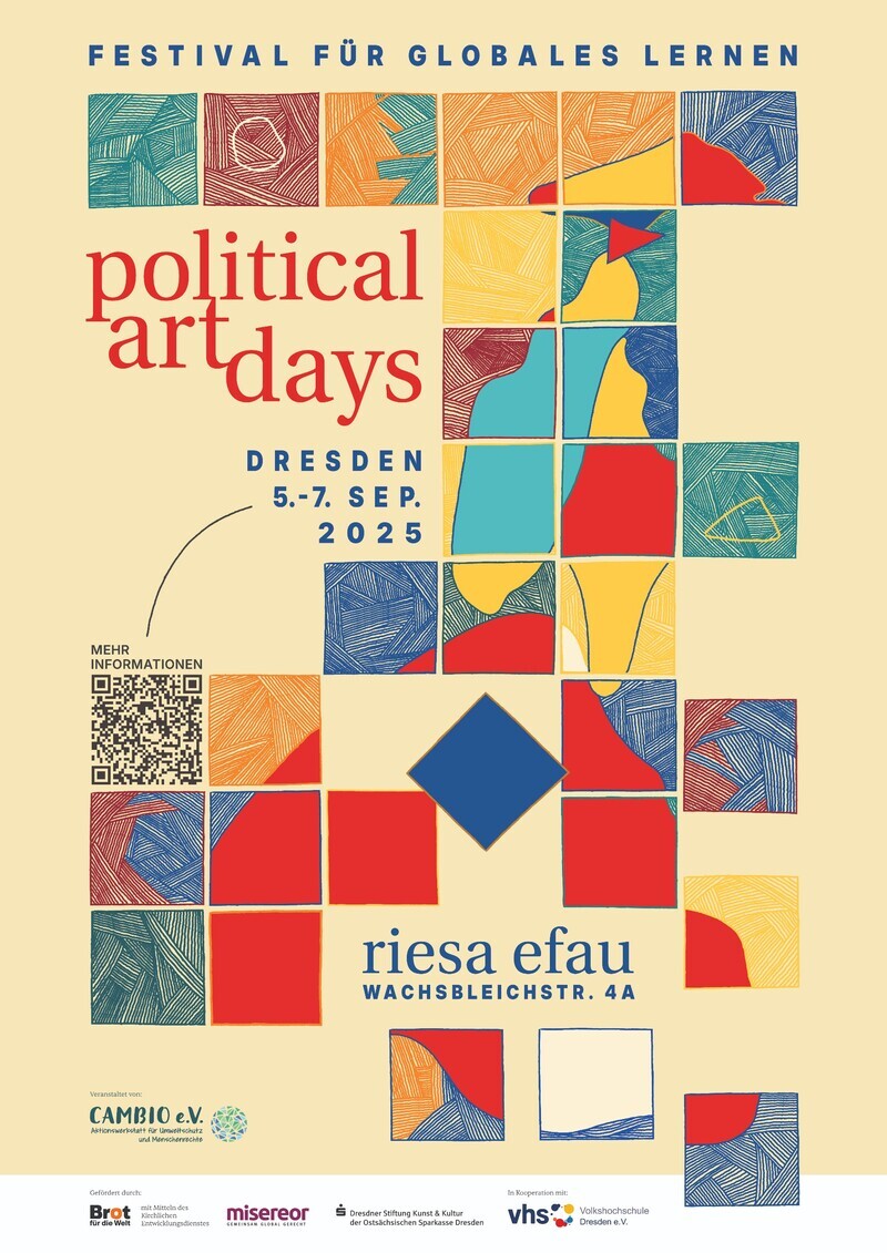 Die Political Art Days feiern 2025 ihr 10-jähriges Jubiläum. In diesem besonderen Jahr richten wir den Fokus auf Methoden und Perspektiven, die globale Zusammenhänge sichtbar machen – und zeigen, wie unser Lebensstil im Globalen Norden das Leben anderer Menschen beeinflusst. Global Citizenship Education (GCED) hat zum Ziel, das Zugehörigkeitsgefühl zur Weltgemeinschaft zu fördern und Verständnis über die Wechselwirkungen von lokalem und globalem Handeln zu vermitteln.
