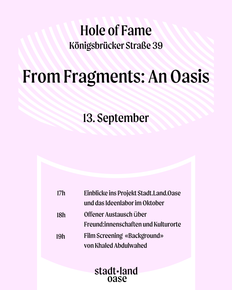 Wir heißen euch zu unserer Veranstaltung „From Fragments: An Oasis“ willkommen.