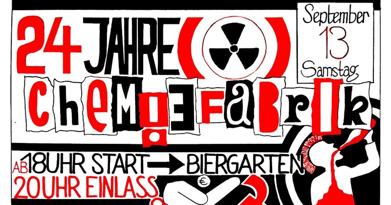 Mit 24 Jahren ist das Vierteljahrundert für die Chemiefabrik bald voll und daher lassen wir es dieses Jahr nochmal alles etwas ruhiger angehen. Ab 18:00 Uhr hat der Biergarten geöffnet und wir hoffen während der letzten Sommertage mit vielen bekannten Gesichtern zusammensitzen zu können. Aber so ruhig bleibt es dann doch nicht, denn mit den Spittin Bones im Gepäck bekommt ihr eine ordentliche Ladung Punkrockhits auf die Ohren und wenn eure Beine danach immer noch zappeln wollen, könnt ihr ihnen diesen Wunsch bei den fanstastischen Vinylakrobaten des Abends an den Plattenspielern erfüllen.
