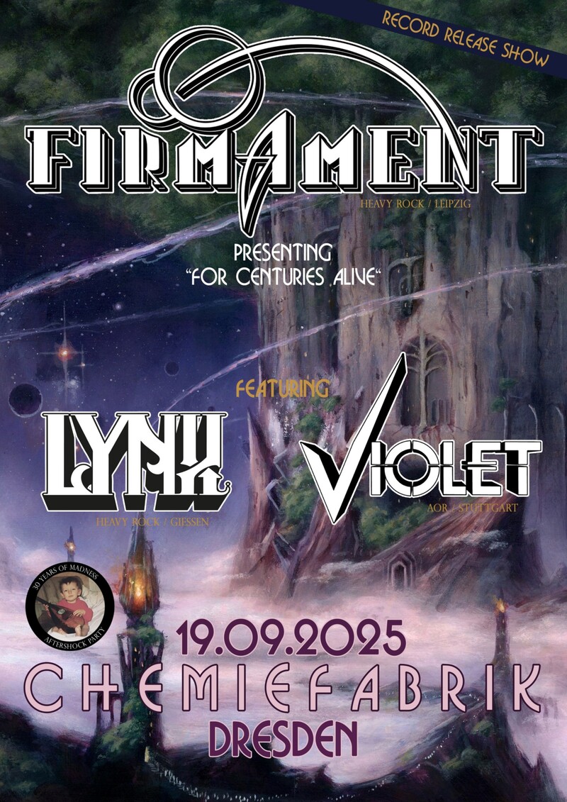 Mit epischem Sound zwischen Hard Rock und NWOBHM präsentiert das Quintett aus Drums, Bass, Twin-Gitarren und Gesang ihr neues Album „For Centuries Alive“ (VÖ: 19.09.2025, Dying Victims Productions). 2021 aus ehemaligen Mitgliedern der Band Tension gegründet, kann die Band bereits auf ihr Debütalbum sowie eine Split EP mit den Hamburgern Midnight Prey zurückblicken. Die Band hat sowohl durch ihre vorangegangen Releases als auch durch zahlreiche Live Gigs konsequent an ihrem Sound gearbeitet und den eigenen Trademarks zahlreiche neue Farbtupfer verpasst. Damit feiern Firmament den Beginn des zweiten Kapitels Ihrer Reise am 19.09.2025 in der Chemiefabrik Dresden – ein Abend voller Heavy Rock mit reichlich Energie und Spielfreude.