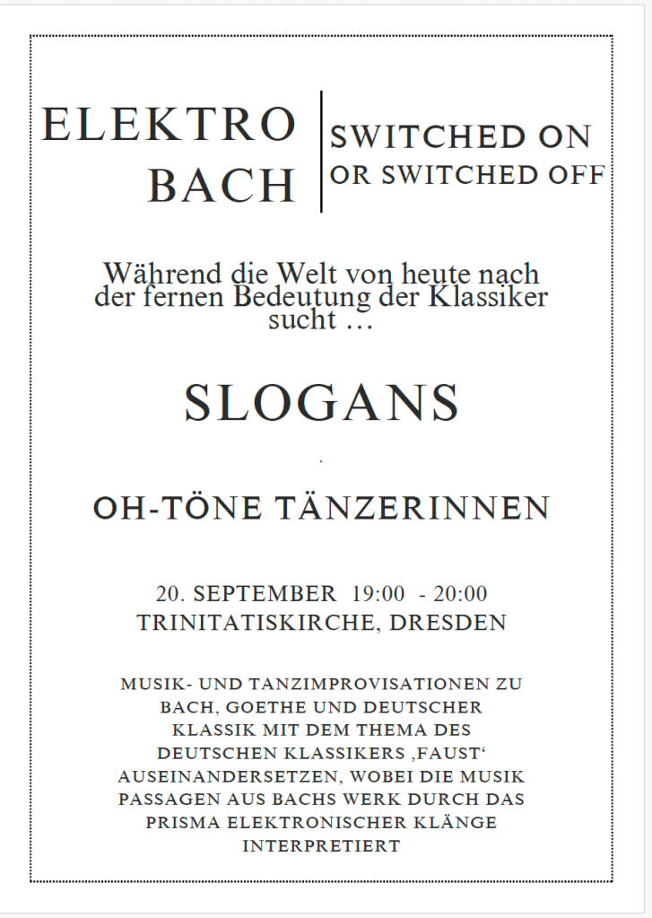 Musik- und Tanzimprovisationen zu Bach, Goethe und deutscher Klassik mit dem Thema des deutschen Kassikers 'Faust' auseinandersetzen, wobei die Musik Passagen aus Bachs Werk durch das Prisma elektronischer Klänge interpretiert.