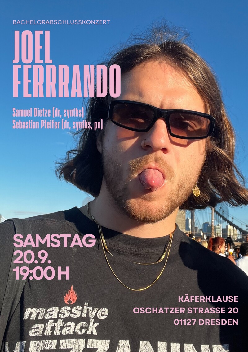 Der in Dresden ansässige Trompeter Joel Ferrando präsentiert im Rahmen seines Bachelorabschlusses an der Hochschule für Musik sein Abschlusskonzert – das Ergebnis von sechs Jahren intensiver künstlerischer Auseinandersetzung. Gemeinsam mit Samuel Dietze (Schlagzeug, Synthesizer) und Sebastian Pfeifer (Schlagzeug, Synthesizer, Piano) entwickelt Ferrando ein Klanguniversum, das sich zwischen Noise, Avant-Garde, Mikrotonalität und strukturierten Grid-Kompositionen bewegt. Die drei Musiker setzen auf Reibung und Resonanz: komplexe Rhythmen und mikrotonale Verschiebungen treffen auf elektronische Soundflächen und eruptive Improvisation. So entstehen fragile, rohe und gleichzeitig vielschichtige Klanglandschaften, die sich jedem einfachen Genrebegriff entziehen. Das Konzert ist in zwei Sets gegliedert und lädt das Publikum ein, tief einzutauchen in eine Musik jenseits tradierter Hörgewohnheiten. Radikal, forschend.