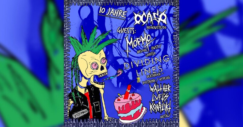 Am Einheitstag wird in der Chemo einer mindestens genauso historisch relevanten Vereinigung mit viel Melodie und Geballer gedacht. Die Crust-Jünger der lokalen Neocrust-Combo OCASO haben es in den letzten 10 Jahren trotz zahlreicher Touren im In- und Ausland zu keinem nennenswerten Bekanntheitsgrad gebracht und das ist ein Grund zum Feiern! Im Gepäck FrOi!nde, Bekannte, Weggefährt*Innen und Lieblingsmusik. Deshalb freut sich die Band ihre gleichfalls erfolgslosen Wegbegleiter von WALTHER LUFT’s KONFLIKT aus der Partnergemeinde Brand-Erbisdorf dabei zu haben, die mit Ihrer Mischung aus zarten Post-Metal Riffs bis crustigem Gehacke ganz nebenbei auch auf ihr 10-jähriges Überleben zurückblicken. Für den Internationale Charakter des Abends finden sich die langjährigen FrOi!nde aus dem sonnigen Larissa (GR) zum Harmoniker-Stammtisch ein und bringen innovativen, hochgradig melodischen Crust mit, welcher fast ohne D-Beat auskommt, ohne einschläfernd zu wirken. Stargast des Abends sind die allseits bekannten und beliebten Deathrocker*Innen von DIVIDING LINES aus der sächsischen Provinz Leipzig die sich nicht nur instrumental, sondern auch stimmlich mit melodischen Interpretationen von Alltags- bis Weltuntergangsthemen befassen. Im Anschluss kann zur Aftershow abgezappelt werden.
