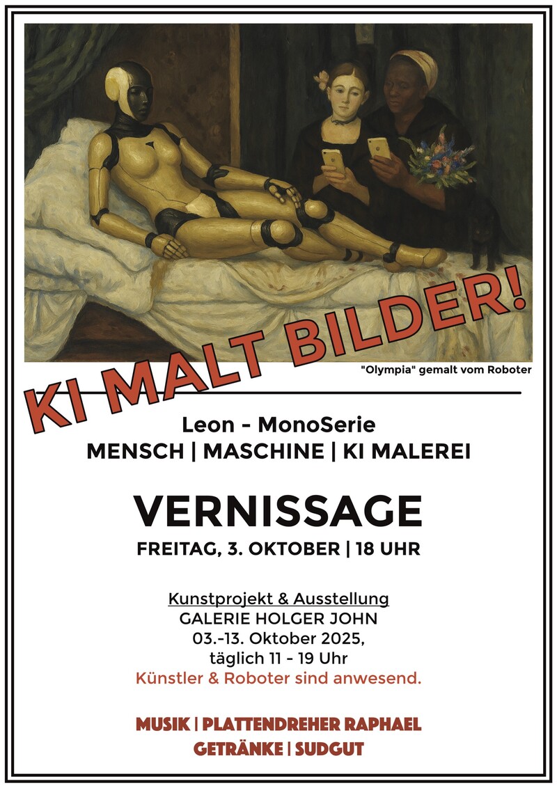 Mit Redebeiträgen von Leon: Vom Burnout zum Durchbruch. Wie der Verlust seiner Fassadenmaler-Karriere zum Startschuss für eine völlig neue Art der Malerei wurde. Wandel als Überlebensstrategie in schnellen Zeiten. Erste Einzelausstellung von Leon. Leon (28), geboren im Westen, aufgewachsen im Osten, Diplomand der HFBK Dresden, ist seit seinem 16. Lebensjahr selbstständig und hat für Konzerne wie Amazon, Tesla, Netflix und Aldi monumentale Fassaden geschaffen. Heute verbindet er Handwerk und Technologie: Seine Werke entstehen mit Robotern und zeigen eine Einheit von Mensch, Maschine und KI.