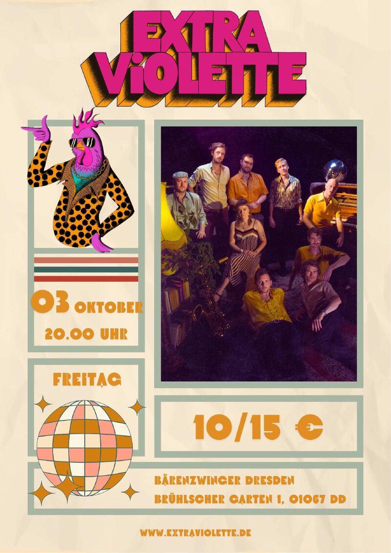 Schnallt euch an, Zeitreisende! Am Freitag, den 03.10.25, verwandelt sich der Bärenzwinger in eine glitzernde Disco-Dystopie, wenn Extraviolette die Bühne stürmt. Die neunköpfige Disco-Hydra aus Leipzig ist bekannt für ihre tanzekstasischen Live-Shows: eine Mischung aus Disco, Funk und Soul, die mindestens eins eurer Beine mitreißt und die Zeit vergessen lässt. Mit fluffigen Basslines, funkiger Gitarre und Bühnenoutfits, die alle Sinne fluten lässt, steht Extraviolette für Befreiung und die Nacht durchtanzen – die Farbe der Emanzipation. Es erwartet euch eine Reise durch knallbunte 70s-Vibes und rollende Beats – serviert mit einer ordentlichen Portion Retro-Raketentreibstoff! Ob in Glitzerjacken, Neon-Leggings oder Raumanzügen: Hier wird getanzt, bis die Augen flimmern und die Platten schmelzen. Und das Beste: der frühe Vogel fängt den Discowurm, der sich am 03.10.25 schon pünktlich 20.00 Uhr im Schlengeltanz über die Bärenbühne windet!