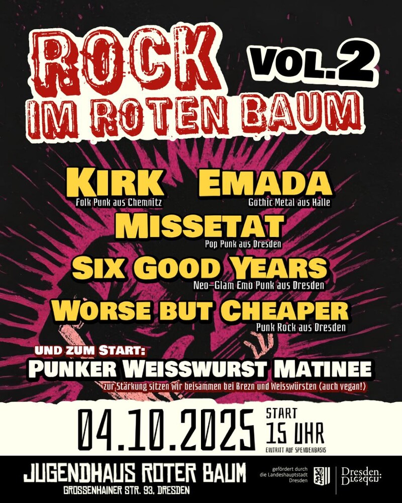 Gestartet wird um 15 Uhr mit der Punker Weißwurst-Matinée: Einem Weißwurst-Frühstück am Nachmittag, mit Weißwurst und Brezn. Die gibt’s auch vegan, dank der Veganen Fleischerei Dresden. Danach geht’s direkt in einen Nachmittag und Abend mit treibenden Riffs.