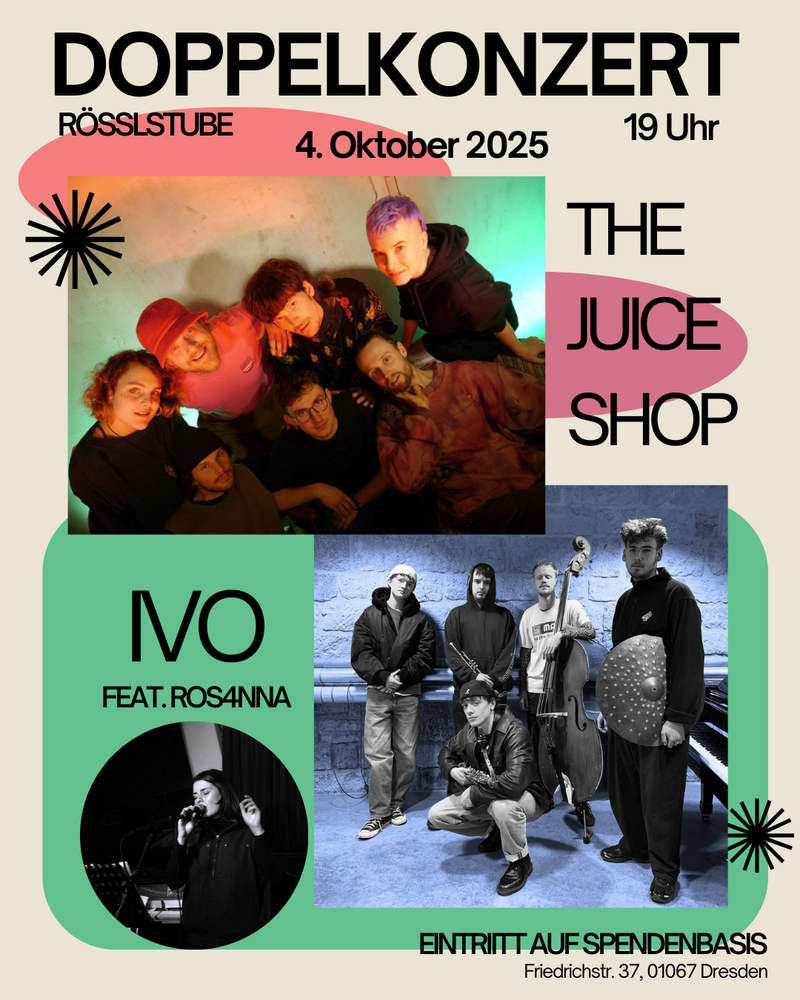 Es wird fruchtig wild und unglaublich schön. Der Juice Shop hat für uns schon letztes Jahr bei unserem Rössljuliläum zum 10 Jährigen Geburtstag dicke eingeheizt, diesmal dabei auch die wunderbaren Ivo & Ros4nna. Kommt vorbei wenn es wieder heißt: Rössl goes live <3 THE JUICE SHOP ist eine sechsköpfige Band aus Leipzig, Dresden und Köln, die eine einzigartige Mixtur aus bouncy Beats, souly Melodien, und den jazzy Früchten, die das Leben trägt, kreiert. Experimenteller Neo Soul der etwas zu sagen hat, dich mit auf eine Reise nimmt und dein Herz berührt. Geführt von einer erfrischenden Symbiose aus Gesang und Rap liefert der Juice Shop ein entsaftendes Live-Erlebnisder Extraklasse. Saft wird gepresst, Hüften werden wie Smoothies geschüttelt und wenn man genau aufpasst kann man sogar den Vögeln beim zwitschern zuhören. Schlagzeug, Bass, Percussion und Keys legen ein fruchtig sahniges fundament für die Kirsche oben drauf bestehend aus Posaune und Trompete. If you're down and have the blues Come with us and Choose the Juice IVO, ein kürzlich in Dresden gegründetes Quintett, erforscht dynamische Konzepte und lässt sich von Jazz, Pop, R’n’B und Fusion inspirieren. Mit reichen harmonischen Texturen, markanten Synthesizern, präzisen Bläserarrangements, treibenden Rhythmen und einem frischen kreativen Ansatz erschafft die Band eine Vielzahl unterschiedlicher Klangwelten. Ihre aktuelle Zusammenarbeit mit der Sängerin ROS4NNA verleiht Ivos Sound durch ihre soulig-klangvolle Stimme eine kraftvolle neue Dimension. Gemeinsam kreieren sie Musik, die sowohl raffiniert als auch zugänglich ist.