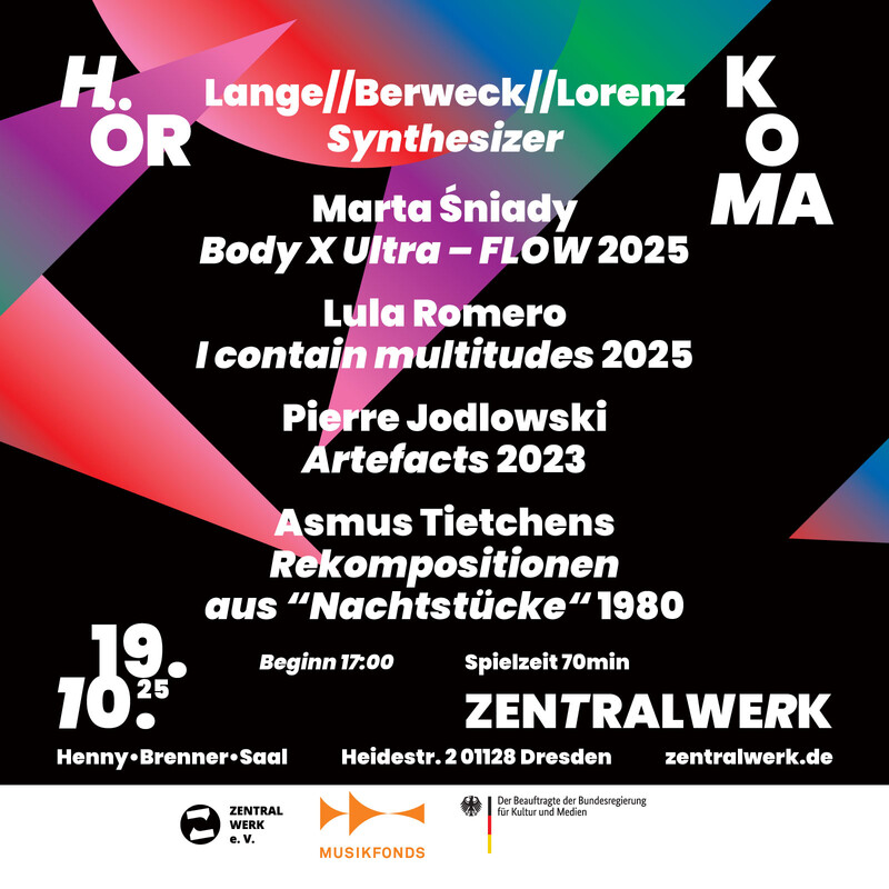 Programm: Marta Śniady: Body X Ultra – FLOW (2025) Lula Romero: I contain multitudes (2025) Pierre Jodlowski: Artefacts (2023) Asmus Tietchens: Rekompositionen aus „Nachtstücke“ (1980)