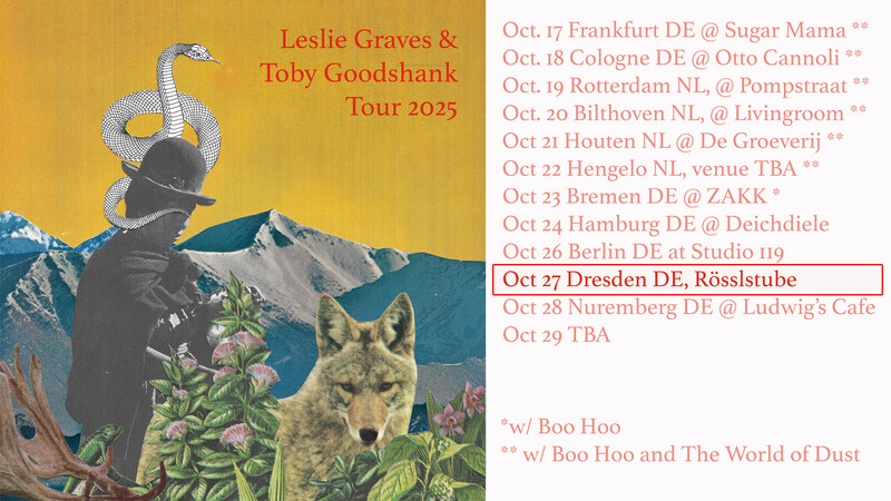 Die Rösslstube is happy to announce: Leslie Graves and Toby Goodshank Brooklyn-based artists Leslie Graves (Gold, Endless Arrows) and Toby Goodshank (The Moldy Peaches, The Pizza Underground) have joined creative forces on their forthcoming album Between Worlds (BB*Island). Acoustic guitar and vocal harmonies make up the core of their music, which draws from a variety of folk-rock influences including Sybil Baer, Judee Sill, REM, Linda Perhacs, and Jessica Pratt. Their lyrics are dreamlike stories that speak to the resilience of humanity, and offer a meditation on love, nature and growth. Many instrumental threads are interwoven throughout with the invaluable skills of Jake Nicoll (The Burning Hell) who lovingly engineered and embellished the recordings. Speaking to their process, Leslie writes, "Toby is great at composing song structures quickly. It was fun to feel into the emotion of the chords and write from there. The process was like chiseling away at a stone to reveal the sculpture underneath. I like when songs come like that - when it feels that they are teaching us as they are revealed."