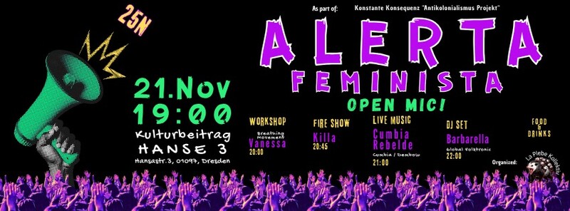 La Plebe Kollektiv präsentiert, im Rahmen des antikolonialen Projekts Konstante Konsequenz, diesen Freitag, den 21. November, das Gedenken an den 25N – Internationaler Tag zur Beseitigung von Gewalt gegen Frauen.