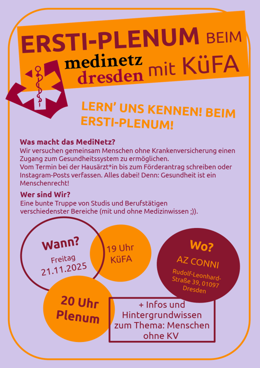 19 Uhr Küfa und ab 20 Uhr Vorstellung unserer Medinetz-Arbeit und Projekte + Warum es uns eigentlich braucht! und im Anschluss kurzes Plenum und vielleicht hast Du ja Lust zu bleiben?