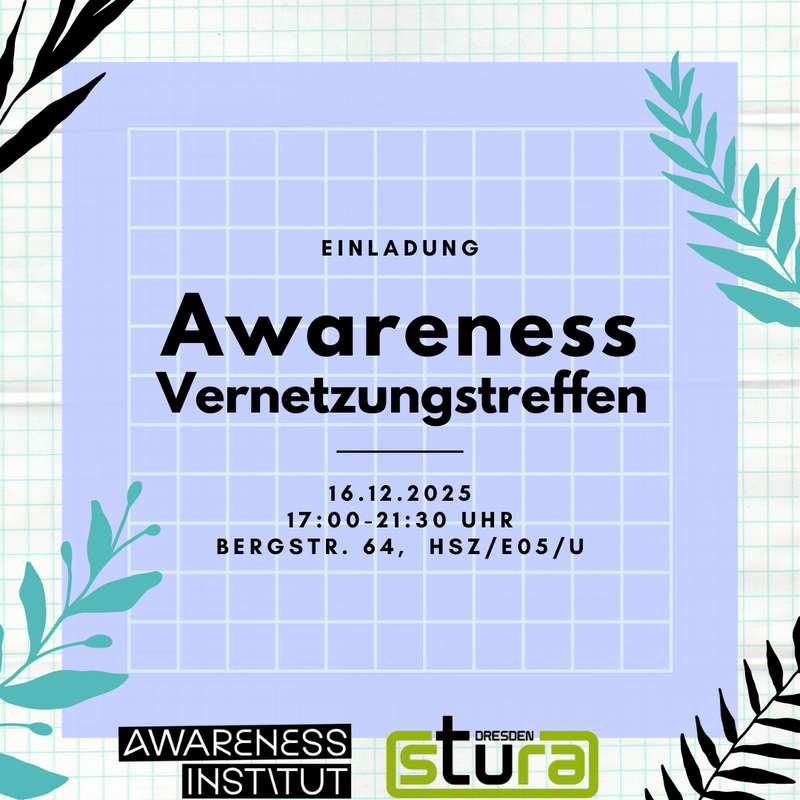 Wir – Wolke (sie/ihr, studentische Koordination für Awareness am StuRa der TU Dresden) und Fin (er/keine, Anlaufstelle Ost vom Awareness Institut) – laden euch herzlich zu einem Vernetzungstreffen ein.