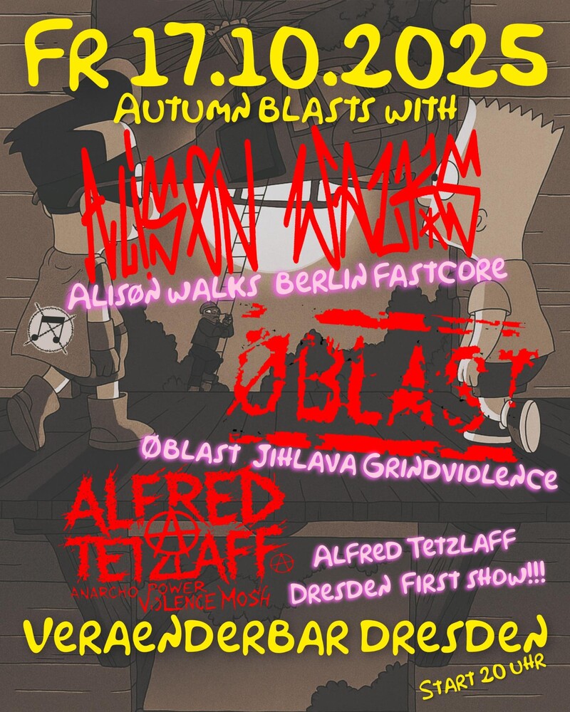 Zu den AUTUMN BLASTS in der Veränderbar gibt es Fastcore von ALISØN WALKS, Grindcore Power Violence von ØBLAST und Anarcho Power Violence Mosh von ALFRED TETZLAFF auf und in die Ohren!