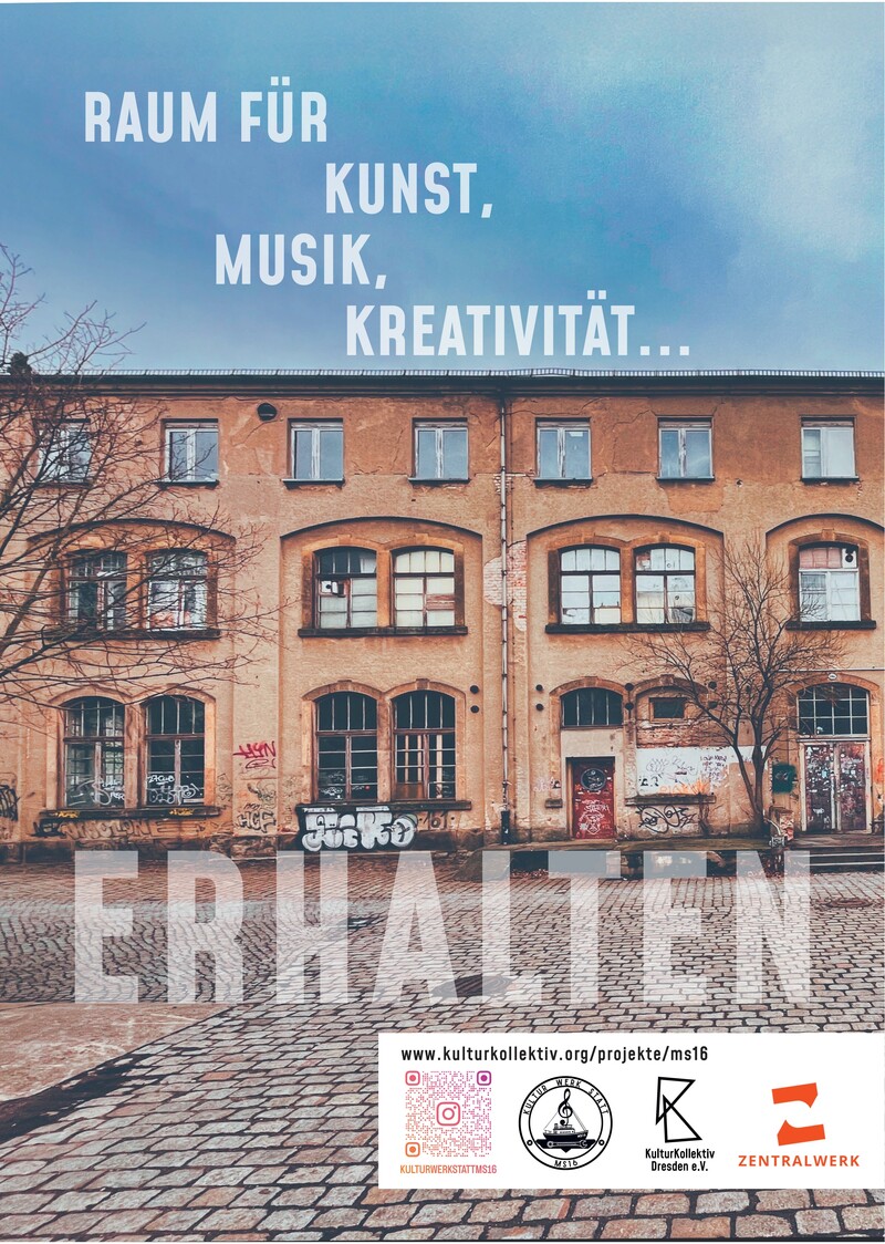 Langjährige Nutzer*innen der Meschwitzstraße 16A haben sich zusammengeschlossen und das Projekt KULTURWERKSTATT MS16 ins Leben gerufen. Gemeinsam mit erfahrenen Partnern wie dem KulturKollektiv Dresden e.V. sowie der Zentralwerk Kultur- und Wohngenossenschaft Dresden eG wurde ein tragfähiges Nutzungs- und Finanzierungskonzept entwickelt, um eine stabile Grundlage für die Zukunft der Dresdner Kultur- und Kreativwirtschaft zu sichern.