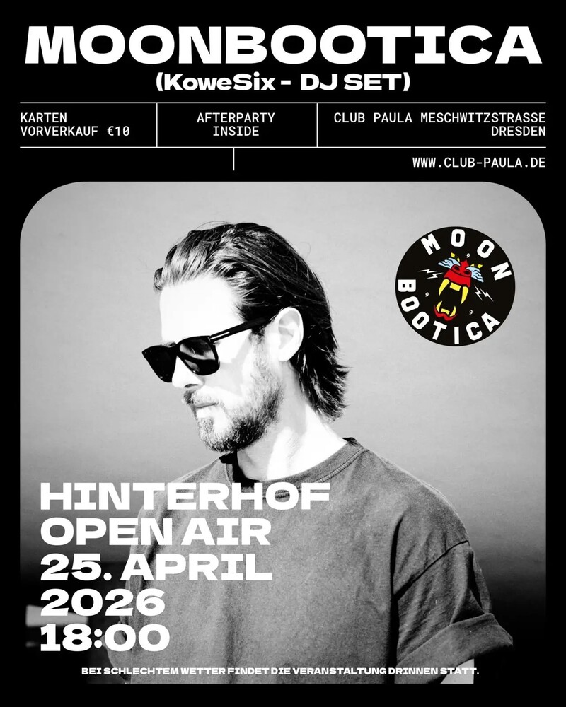 Als Special Guest begrüßen wir Moonbootica (KoweSix DJ-Set). Der Hamburger bringt den unverwechselbaren Moonbootica-Sound in den Paula-Hinterhof – groovig, druckvoll und garantiert tanzbar.