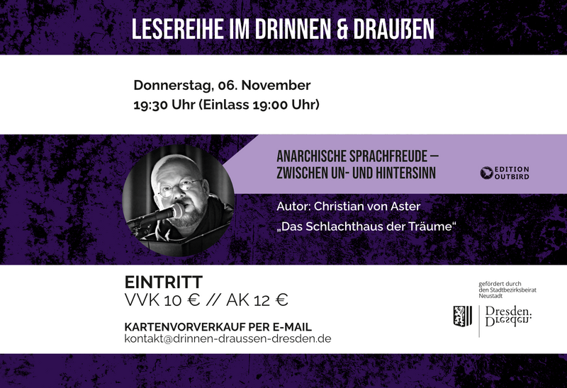 Über den Autor Der Satiriker, Grabredner und Märchenerzähler Christian von Aster stellt seinen Gedichtband „Das Schlachthaus der Träume“ vor. Mit schier anarchischer Sprachfreude lädt Christian von Aster in dieser Sammlung zwischen Un- und Hintersinn zu einem wilden verswärtigen Ritt ein, thematisiert Depression und Gentrifizierung ebenso wie den Wummerlump, die Liebe und das große Vielleicht. In einer Mischung aus Romantik, Dadaismus und Betroffenheitslyrik scheut er, die Untiefen des menschlichen Seins auslotend, weder vor Poesie noch Pathos zurück, um Fragen zu stellen, Antworten zu geben und so dem Schlachthaus der Träume eine Ahnung Hoffnung abzugewinnen. Die Möglichkeit, dass Herr von Aster seine Neuerscheinung „Neudeutsch 2.0“ ebenfalls präsentiert, ist nicht ausgeschlossen. Es wird einen Büchertisch geben.