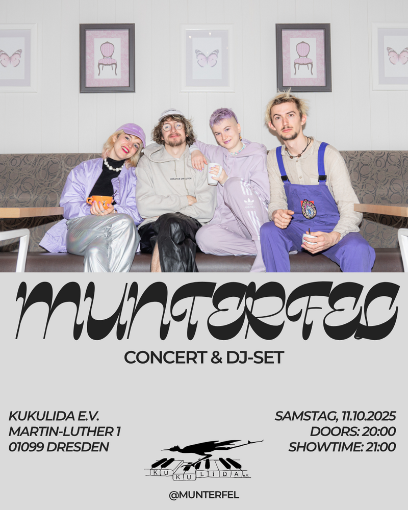 Jawoll, sie kommen wieder zu uns: unsere Leipziger Freund:innen von Munterfel! Das ist immer ein Geschenk! Jazz, Techno, Drum’n’Bass, House... alles raffiniert verwoben mit Können und Style! Da kann maus träumen und sich verlieben! Glaubt ihr nicht? Lassen wir sie selbst zu Wort kommen: „We are Aline, Ida, Laurenz, and Leo – the dynamic quartet behind munterfel.