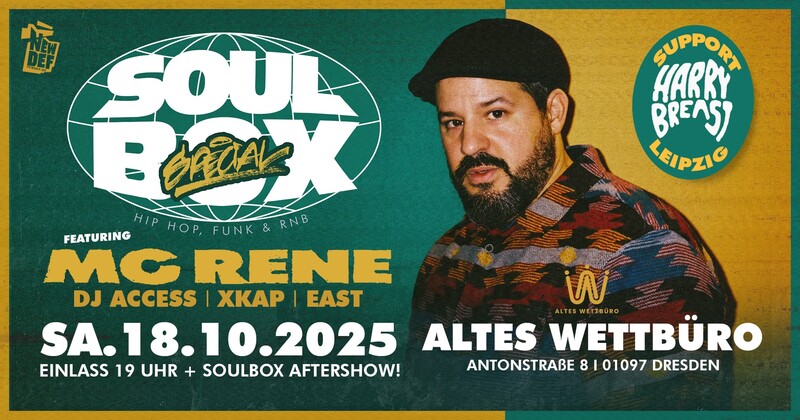 Wir ziehen im Oktober wieder in unser Wohnzimmer und machen es uns mit der Rap-Legende MC RENE gemütlich. Schon lange auf zahlreichen Bühnen und Releases unterwegs, begeistert er nun auch seine Fans im Alten Wettbüro!